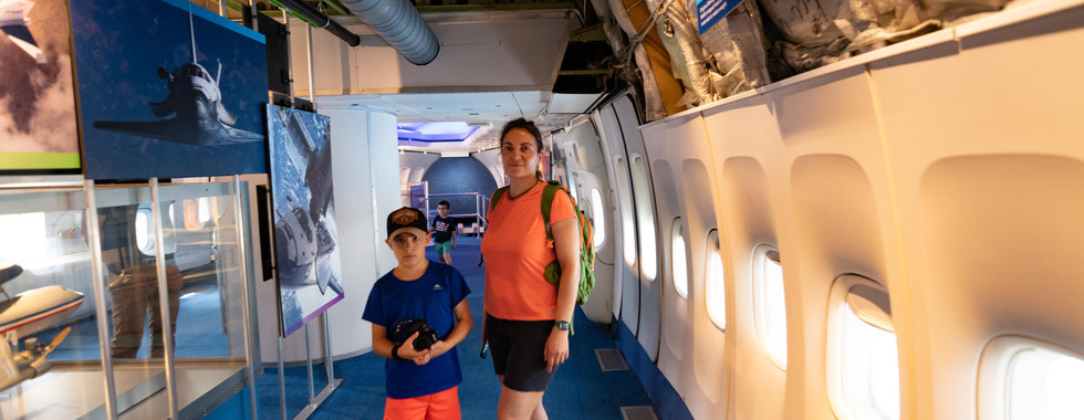 Before continuing our tour we came across a hall where the shuttle mission insignia were framed, the next stop was known as "Independence Plaza" where the Boeing 747 is located next to the replica of the shuttle placed on top, this configuration is used to transport the shuttles to the launch area. To access it you have to climb some stairs, inside the 747 there was a lot of information, explanatory videos and even some game so that the children could load the Shuttle on top of the 747. After that we went up a little more and entered the replica of the shuttle, which It was recreated with great detail, they even had a WC, curious to see where the astronauts could relieve themselves, but without a doubt what I liked the most was seeing the chamber where the space suit and the control cabin were placed, the latter with the control panel turned on, simulating operation. As soon as we saw everything, we went down the stairs, walked a little under the gigantic 747 and then went over to see the no less impressive Falcon 9 from Space X, which by the way has some offices a few meters from the space center.